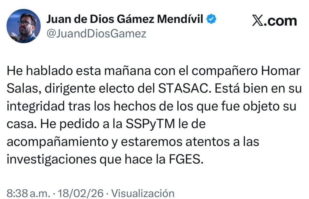 Este ataque se produce en un contexto tenso, pues el viernes pasado, Salas Gastélum había ganado la dirigencia del STASAC para el período 2026-2029.