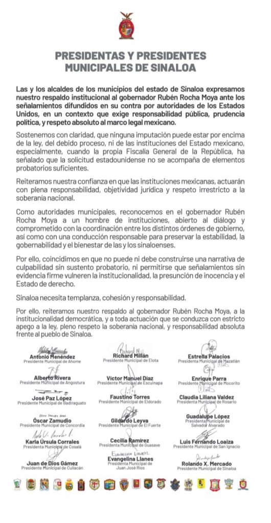 Culiacán, Sinaloa.- En un posicionamiento conjunto, las presidentas y presidentes municipales de Sinaloa expresaron este día su «respaldo institucional» al gobernador Rubén Rocha Moya, frente a los recientes señalamientos emitidos en su contra por autoridades de los Estados Unidos.