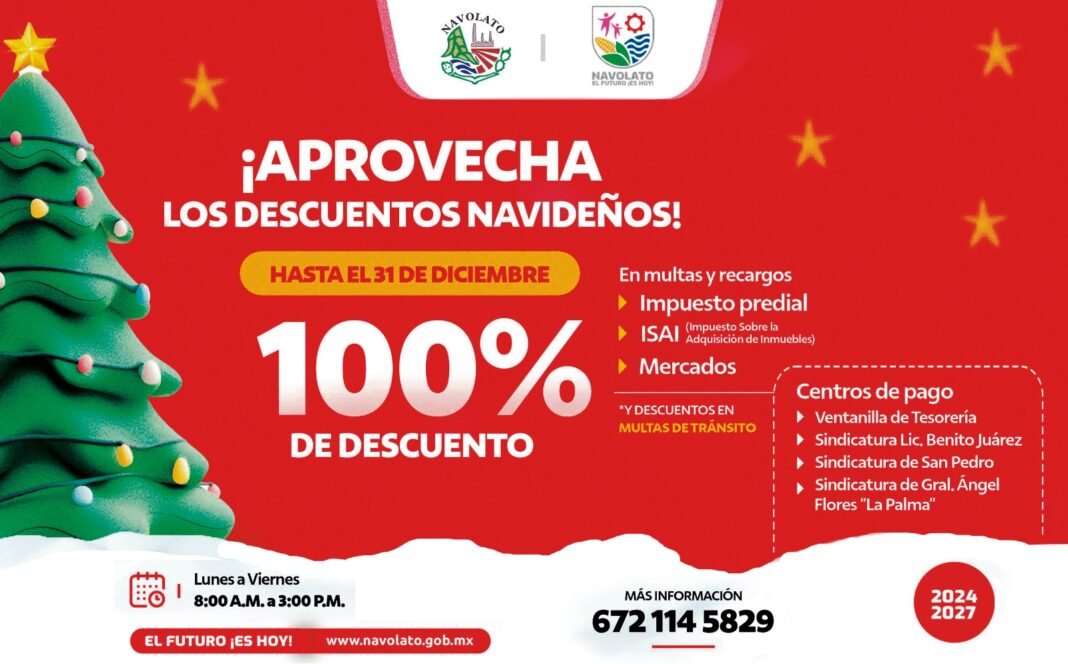 Navolato, Sinaloa.- El H. Ayuntamiento de Navolato lanzó la campaña “Aprovecha los Descuentos Navideños”, una iniciativa que busca aliviar la economía familiar en esta temporada decembrina y facilitar la regularización de las obligaciones fiscales municipales.