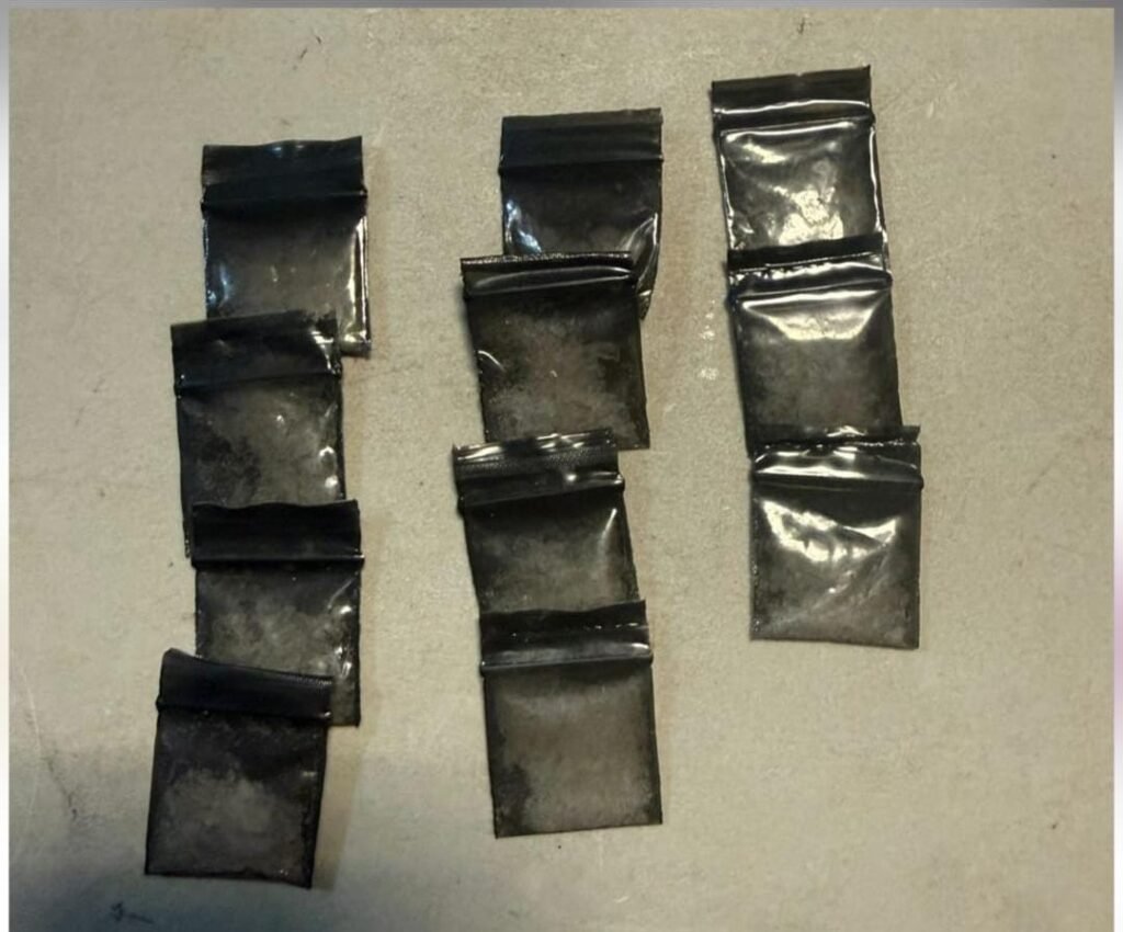 Los elementos preventivos, al verificar los datos de la unidad ligera, encontraron que contaba con alteraciones. Asimismo, se aseguraron 11 envoltorios que contenían en su interior una sustancia con características de metanfetamina, con un peso aproximado de 11 gramos.