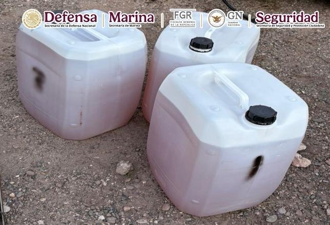 Además, en el municipio de Cosalá, tras labores de investigación, se localizó un área de concentración de material utilizado para la fabricación de metanfetamina. Las autoridades aseguraron 1,550 litros y 275 kilos de diversas sustancias químicas, con un valor aproximado de 37 millones de pesos.