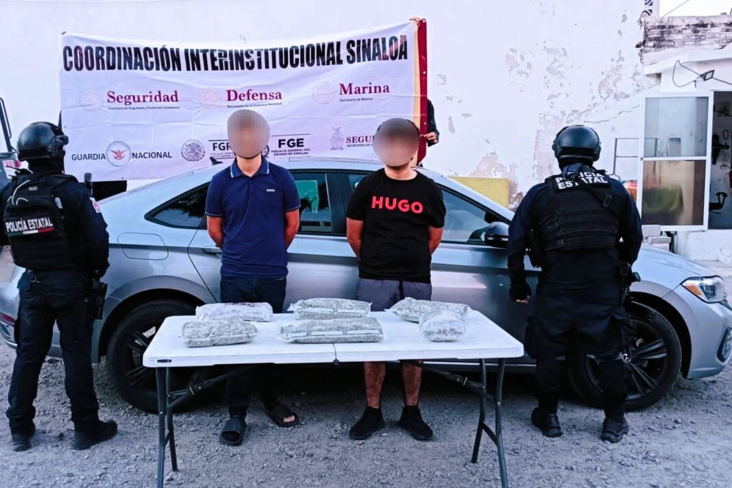 Mazatlán, Sinaloa.— En posesión de presunta marihuana, el Grupo Interinstitucional detuvo a dos masculinos y aseguró paquetes de droga y un vehículo durante un operativo de seguridad realizado en el municipio de Mazatlán, informaron autoridades estatales.