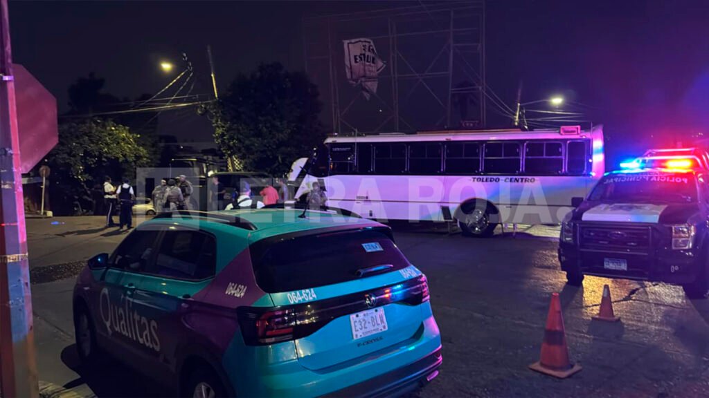 El choque se registró sobre la avenida 21 de Marzo, en la esquina con México 68, cuando la patrulla impactó contra el camión de la ruta Toledo–Centro.