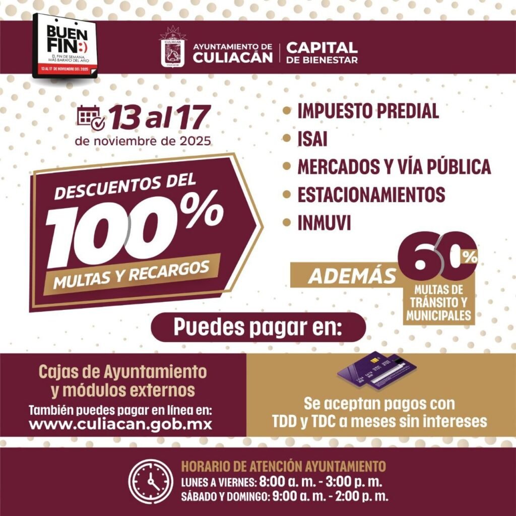 El Ayuntamiento de Culiacán se sumará a el Buen Fin con el objetivo de apoyar la economía familiar y facilitar la regularización de los contribuyentes, además de fortalecer los ingresos municipales.