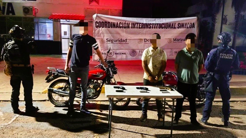 Culiacán, Sinaloa. – Un operativo de seguimiento desplegado por fuerzas federales y estatales en el centro de Culiacán derivó en la detención de tres hombres armados que circulaban en motocicletas, así como en el aseguramiento de armas de fuego, cargadores y cartuchos, informó el Grupo Interinstitucional.