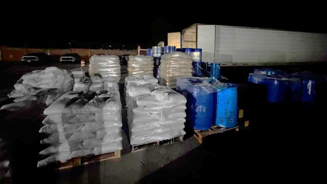 Entre lo incautado había 300 costales con 7,500 kilos de acetona de plomo, 36 costales con 900 kilos de ácido tartárico, 20 tambos con 4,000 litros de etanol, 100 kilos de una sustancia sólida blanca, 4,500 kilos de sosa cáustica y 3,000 litros de químicos diversos, además de otros materiales líquidos utilizados en laboratorios clandestinos.