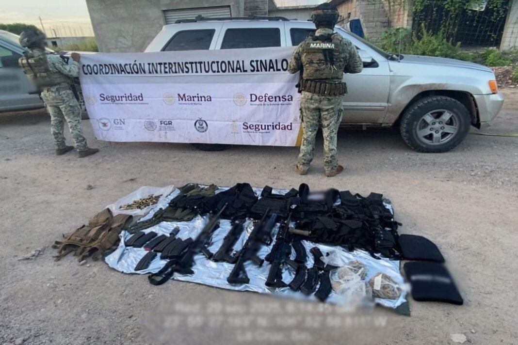 En Elota, las autoridades aseguraron un vehículo, cuatro armas largas, una granada, cartuchos útiles de diferentes calibres, 13 cargadores, seis chalecos tácticos, dos placas balísticas y una fornitura para cargadores.
