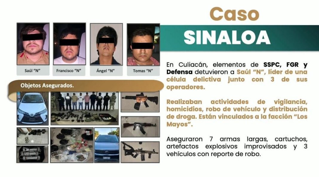 Ciudad de México.- El Gabinete de Seguridad del Gobierno de México informó sobre una acción operativa realizada en Sinaloa, donde fuerzas federales detuvieron a cuatro personas presuntamente vinculadas con actividades delictivas, además de asegurar armamento, artefactos explosivos y vehículos con reporte de robo.