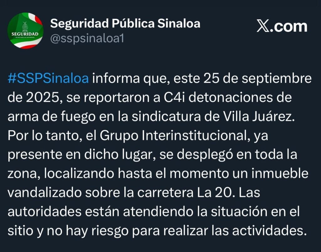 La Secretaría de Seguridad Pública de Sinaloa informó que, a través del C4i, recibió reportes de detonaciones de arma de fuego en la sindicatura de Villa Juárez, lo que activó al Grupo Interinstitucional ya desplegado en la zona.
