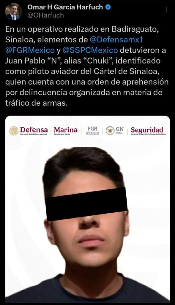 De acuerdo con Omar García Harfuch y su publicación en su cuenta oficial de X, el detenido fungía como piloto aviador al servicio de un grupo delictivo y fue puesto a disposición de la autoridad que lo requiere para determinar su situación legal.