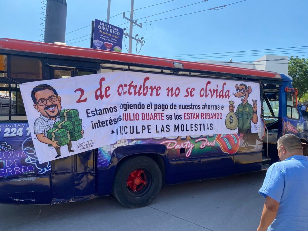 Culiacán, Sinaloa.- Un grupo de jubilados del Ayuntamiento de Culiacán se manifestó este jueves frente a las oficinas del STASAC, bloqueando la avenida Ciudades Hermanas durante 35 minutos con un camión de pasajeros y pancartas contra la dirigencia sindical.