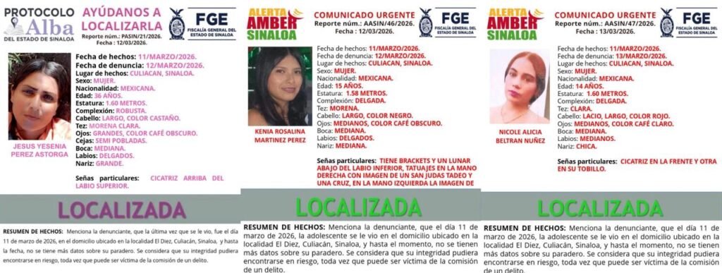 La Fiscalía General del Estado activó fichas de búsqueda del Protocolo Alba. Tras cuatro días, las tres aparecieron con vida. La institución desactivó las fichas pero no informó sobre su estado de salud ni cómo fueron liberadas.