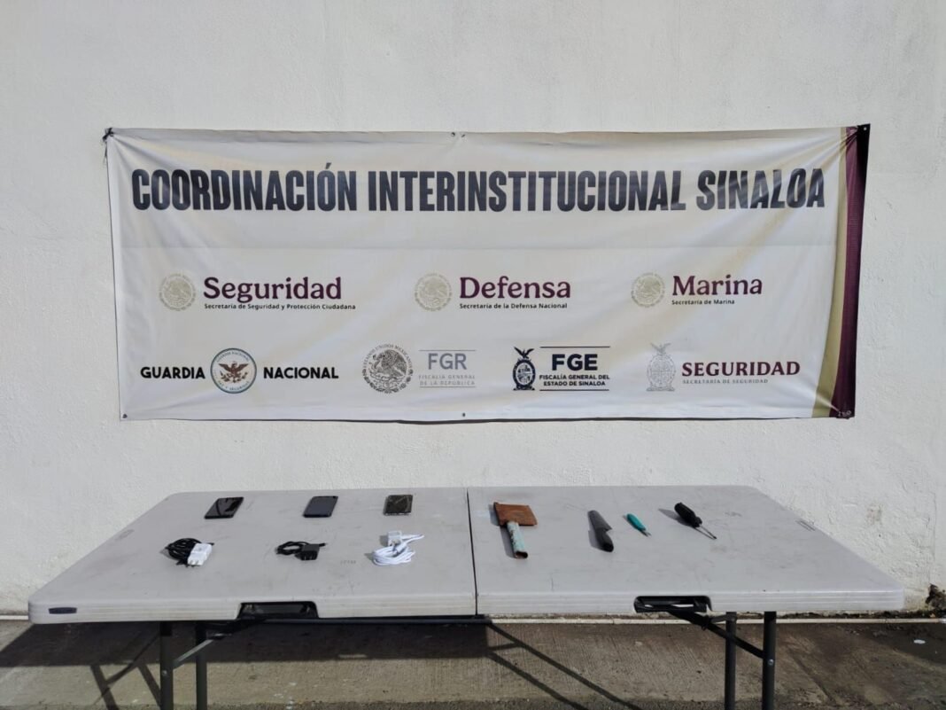 Culiacán, Sinaloa.— Durante una revisión realizada en dos módulos del Centro Penitenciario Aguaruto, autoridades estatales y federales aseguraron teléfonos celulares, cargadores y objetos punzocortantes considerados como artículos prohibidos dentro del reclusorio.