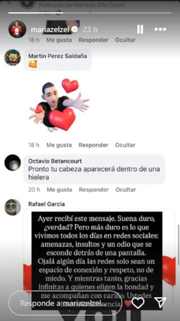 «Ayer recibí este mensaje. Suena duro, ¿verdad? Pero más duro es lo que vivimos todos los días en redes sociales: amenazas, insultos y un odio que se esconde detrás de una pantalla», escribió.