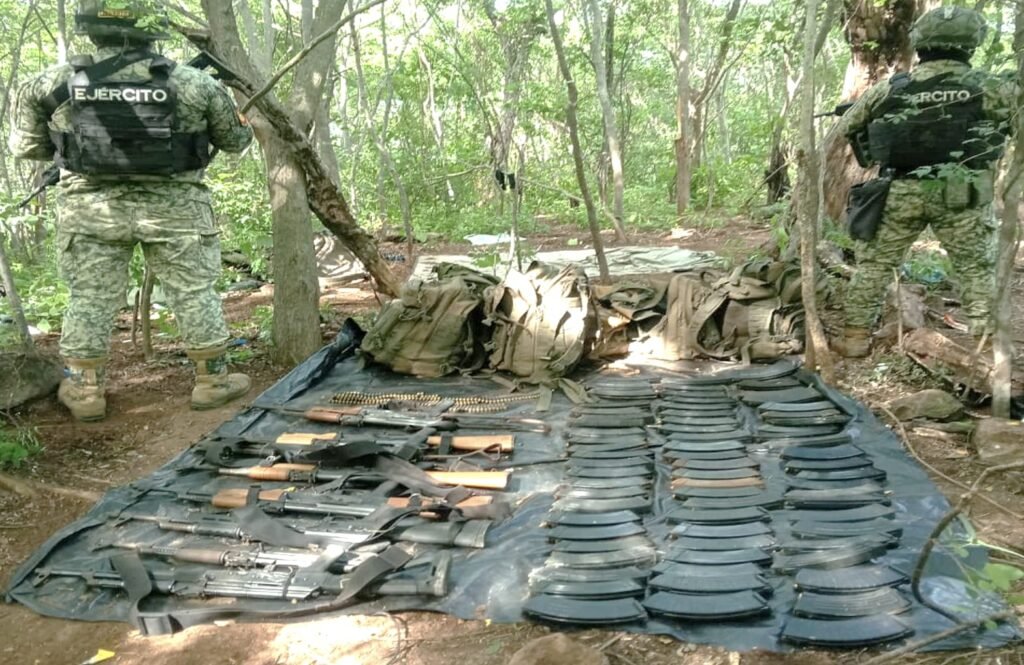 Entre lo asegurado se encontraron 15 armas largas, diversos cargadores y cartuchos, equipo táctico, además de cuatro motocicletas y una camioneta.