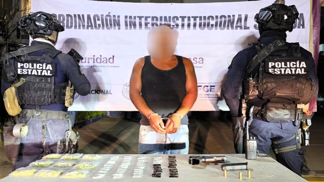 Culiacán, Sinaloa. – Un operativo interinstitucional en la sindicatura de Juan Aldama, conocida como «El Tigre», en el municipio de Navolato, resultó en la detención de un civil que portaba un arma corta, municiones, un radio transmisor y 59 dosis de presunta droga entre metanfetamina y marihuana. El sujeto intentó huir al ver a los elementos, pero fue alcanzado y detenido.