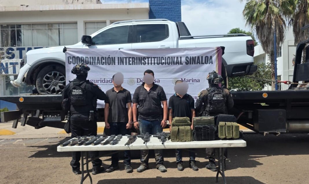 Culiacán, Sinaloa.- Una persecución encabezada por fuerzas de seguridad derivó en la detención de tres presuntos delincuentes, así como el aseguramiento de armas de alto poder y un vehículo con reporte de robo.