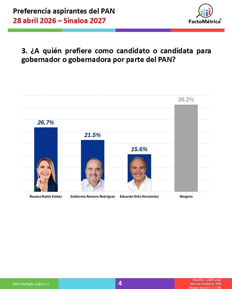 Culiacán, Sinaloa.– La diputada Roxana Rubio Valdez encabeza las preferencias internas del Partido Acción Nacional (PAN) rumbo al proceso electoral de 2027, con un 26.7% de intención de voto, según una medición de FactoMétrica realizada en abril de 2026.