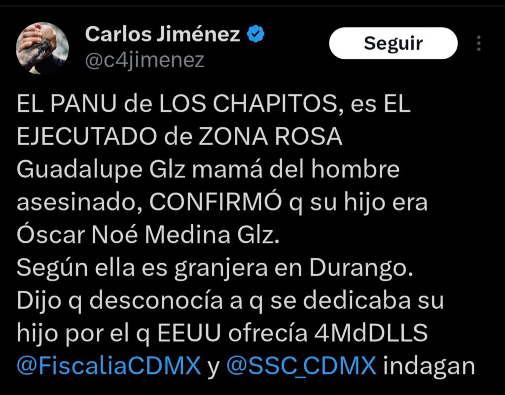 Ciudad de México.— Óscar Noé Medina González, alias “El Panu”, señalado como presunto líder de Los Chapitos, fue asesinado el domingo 21 de diciembre en la Zona Rosa de la Ciudad de México, de acuerdo con información difundida por el periodista Luis Chaparro.