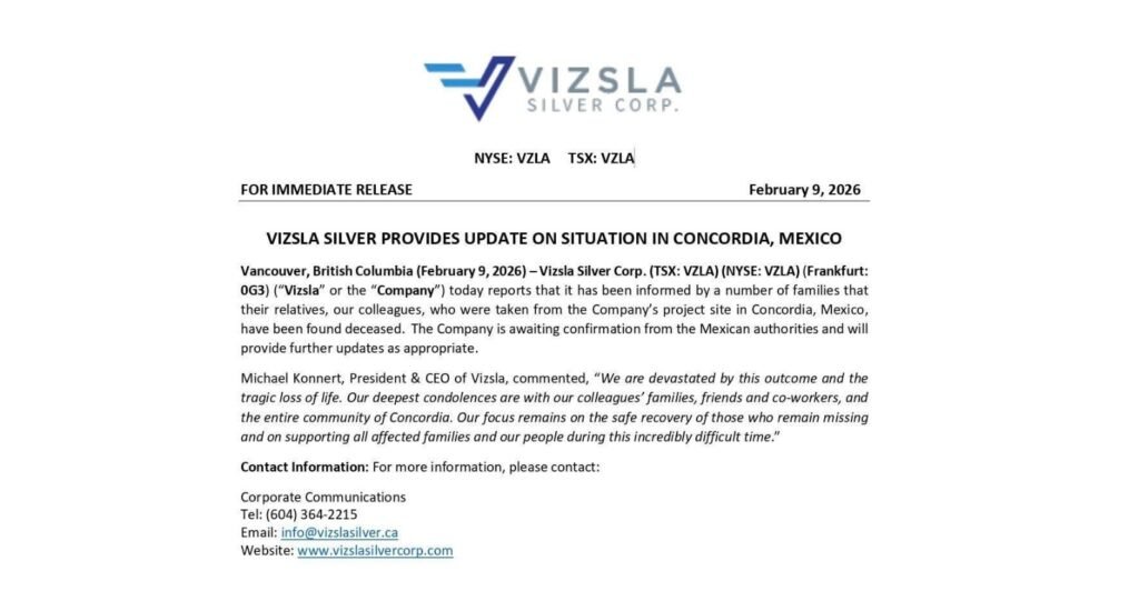 Culiacán, Sinaloa.- La empresa canadiense Vizsla Silver confirmó que varios de los mineros reportados como desaparecidos en Concordia, han sido encontrados sin vida, y que sus familias ya fueron notificadas por las autoridades mexicanas, aunque la compañía señaló que aún no cuenta con información precisa de manera oficial.